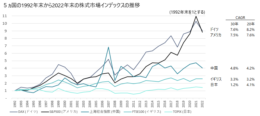 ドイツDAX指数とアメリカのS&P500が、30年間で約9倍になっています。CAGRではドイツが7.6%、アメリカが7.5%になります。それより低いところに中国の上海総合指数がありCAGRは4.8%、それにイギリスのFTSE100の3.3%が続き、最後に日本のTOPIXの1.2%となります。