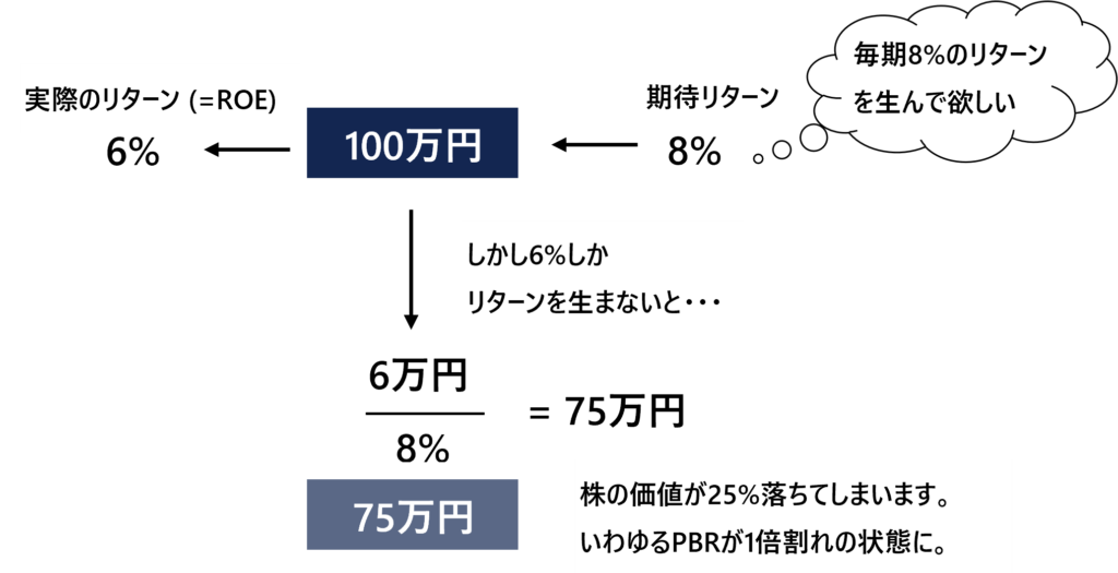 なぜかを簡単に説明しますと、8%のリターンを求める投資家がある企業に出資し、それが100万円だったとします。しかし、実際のROEが6%にとどまる場合、そこから生み出される利益は6万円となります。それが単純に、成長なしに永続すると考えると、6万円/8%=75万円となり、株式の価値は25%下落、株主は損失を被ることになります(その後仮に株が75万円で売却された場合、新たに取得する株主は期待リターンを上げられるわけですが、当初株主含めた全体としては、株主価値は棄損しています。またこの例では考慮されていませんが、内部留保も株主資本に含まれるため、その投資が期待リターンを生まないのであれば、セカンダリーマーケットで株を買った株主から見ても、内部留保を再投資せず、すべて配当や自社株買いで還元して別の投資機会に投資したいというインセンティブが働きます)。