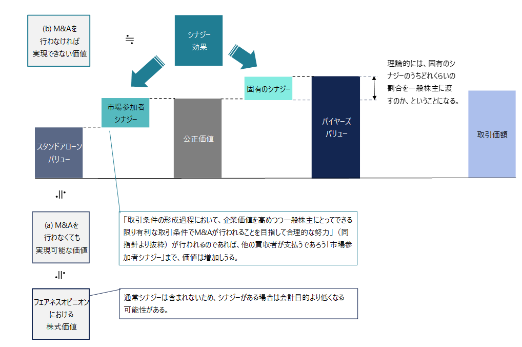 一方で、固有のシナジー部分についてはどこまで一般株主に渡すかは案件次第となり、結局通常の第三者間のM&A同様、取引に十分な参加者がいるのであれば、理論的には取引価額は公正価値以上バイヤーズバリュー未満ということになります。