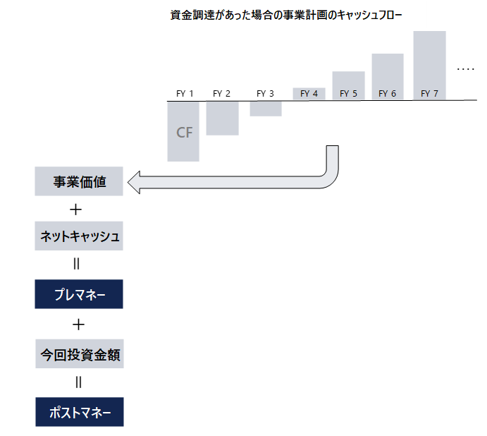 調達後の投資や費用によるキャッシュアウトフローを反映した、資金調達があった場合の事業計画から計算した価値が、「プレマネー」の価値になります(今回の調達額以外のネットキャッシュがある場合は、それを加算します)。そこにさらに今回の調達額を加算して「ポストマネー」の価値になります。