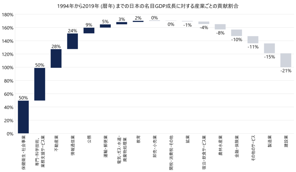 統計の取れる2020年と2021年はCovid19の影響を大きく受けているため、それ以前の2019年までの25年間で取得しました。1994年から2019年にかけて日本の名目GDPは約511兆円から約558兆円(注3)まで増加していますが、産業別にその貢献度を見てみると、医療費等の「保健衛生・社会事業」、人材派遣業や既存の分類に含まれないBtoBビジネスを含む「専門・科学技術、業務支援サービス業」が50%と大きく、それに「不動産」の28%、携帯キャリアや、Web上のサービスを含む「情報通信業」の24%が続きます。