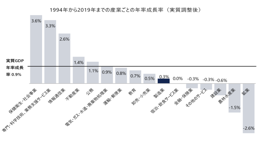 そして、それぞれの産業の名目年率成長率を計算し、それをGDP全体のデフレータで実質化調整したものが、以下のグラフです(注7)。