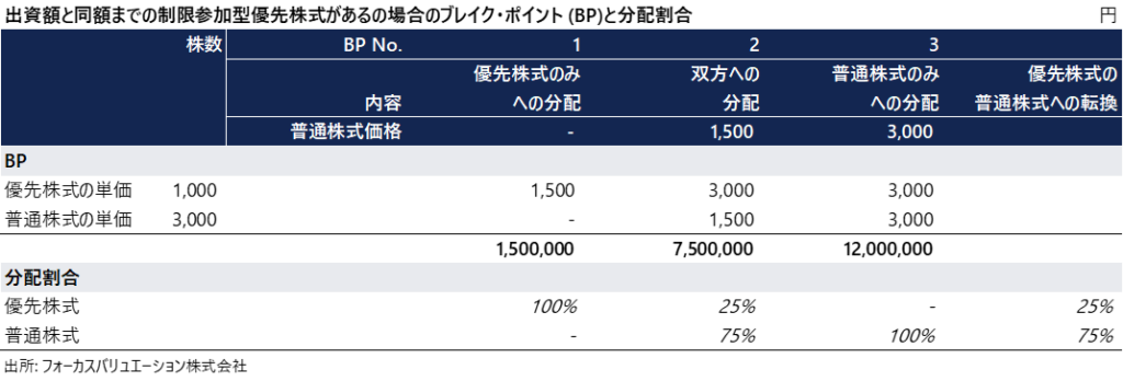 1.5百万円:優先株式への分配が完了する価値総額で、それまで100%優先株式に分配されます。